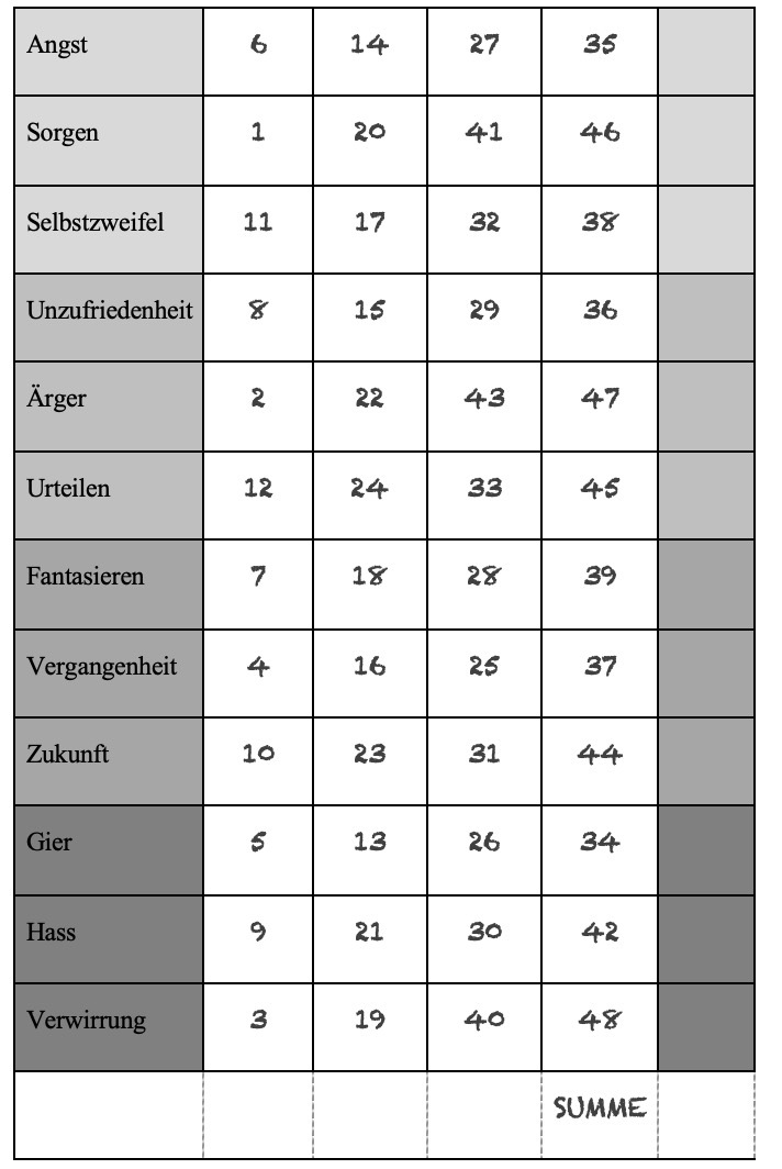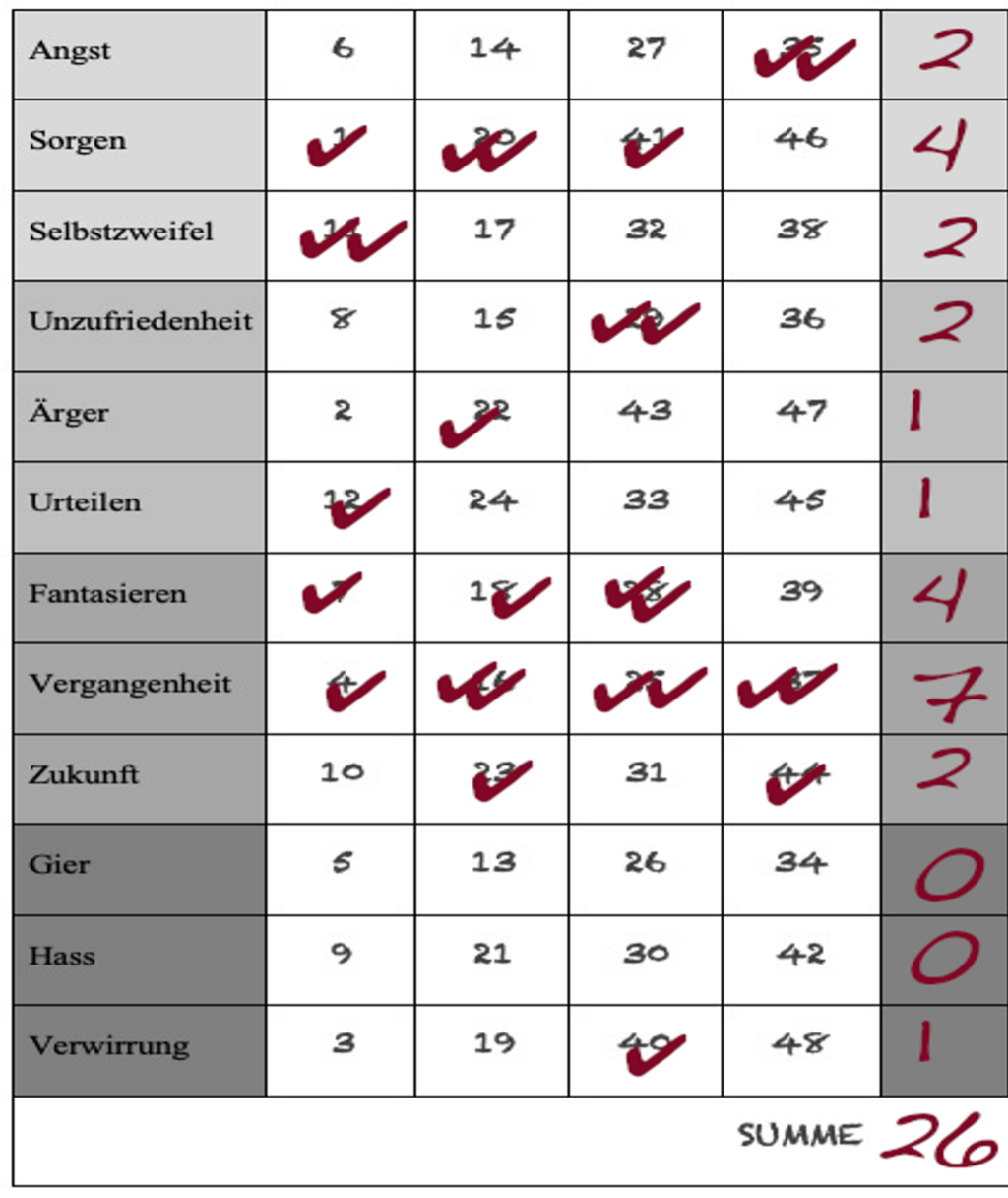 Schau dir dazu an, wie du bei jeder Frage geantwortet hast und such die Nummer der Frage in der Tafel. Die erste Frage findest du beispielsweise in der zweiten Zeile (Sorgen) und der zweiten Spalte (dort steht die 1).