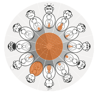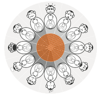 Du siehst die zwölf Affen im Kreis. In jedem Affen sind, wie bei den russischen Matrioshka-Püppchen, kleinere Äffchen.
